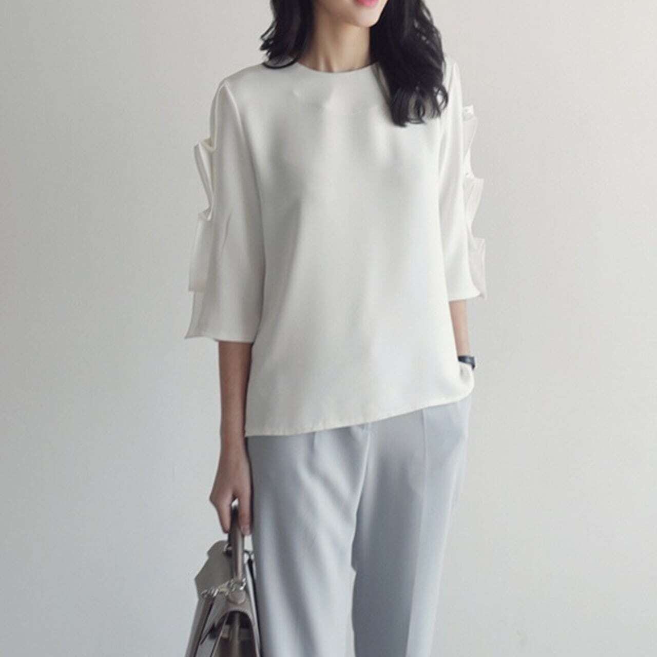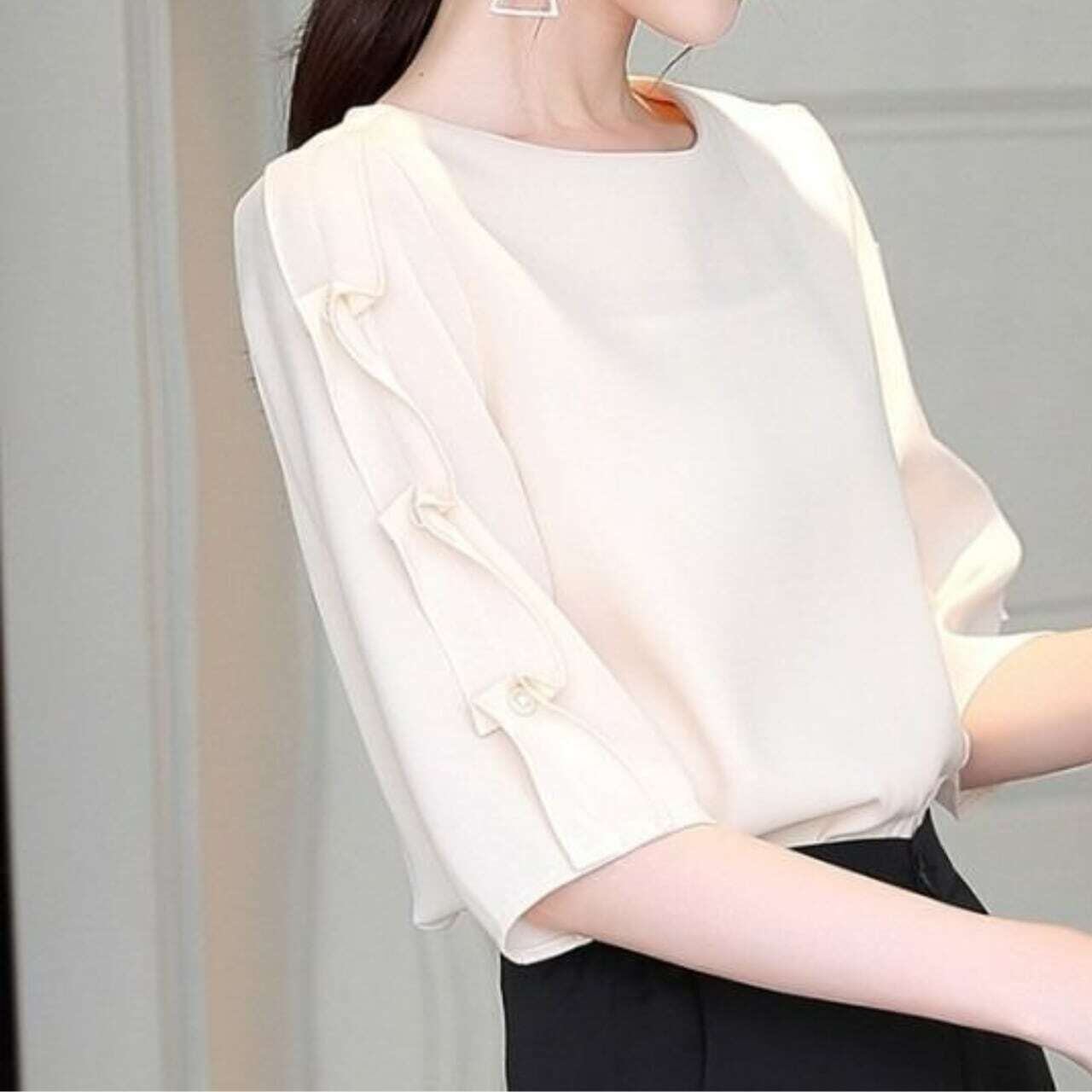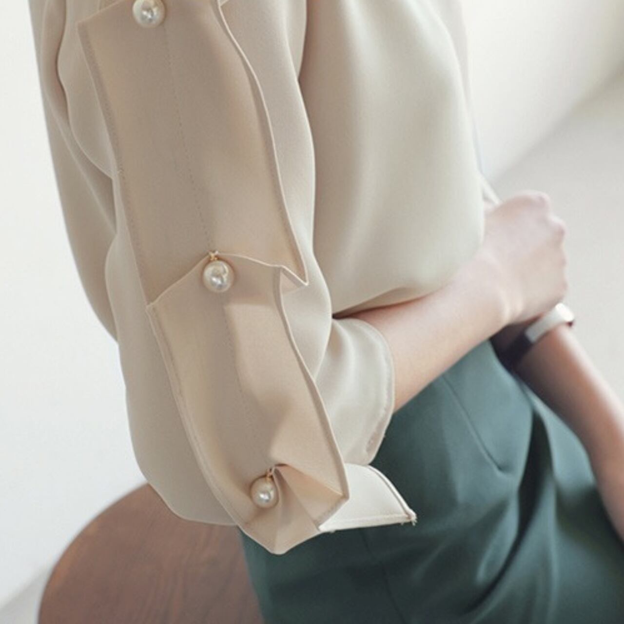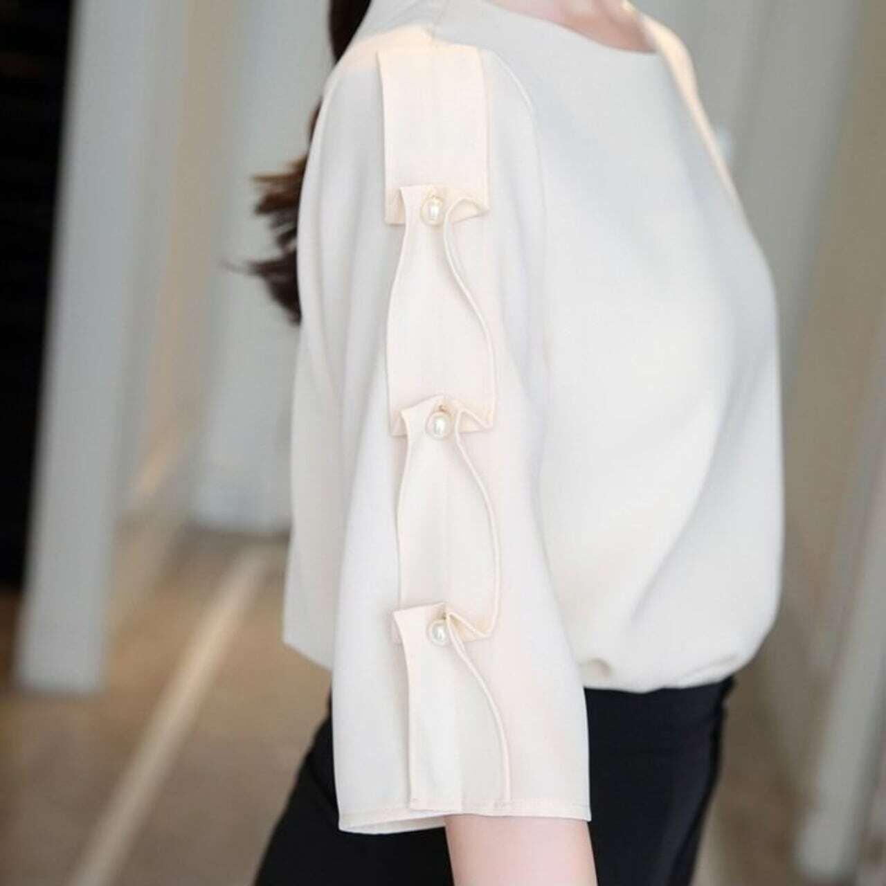 7分袖パール付デザインスリーブトップス