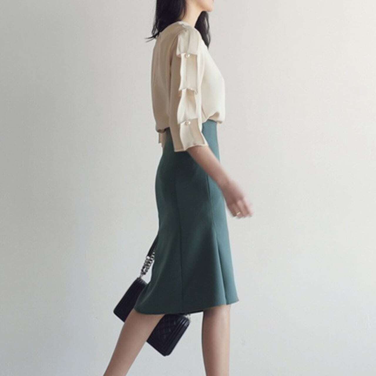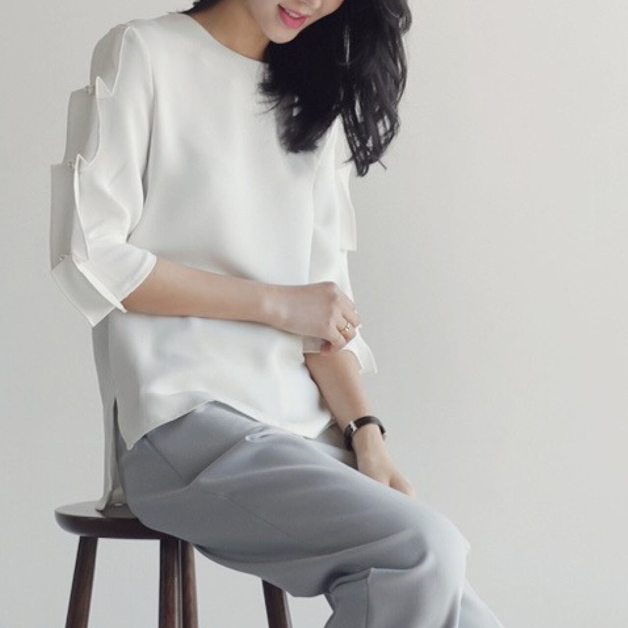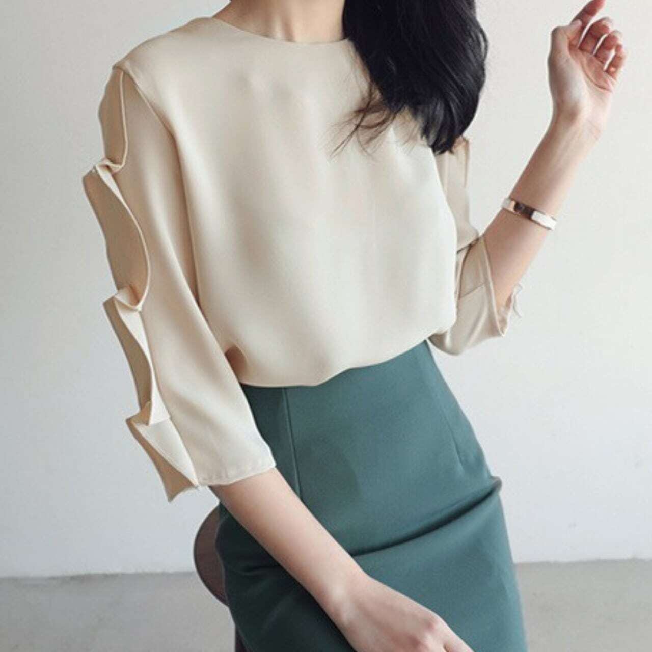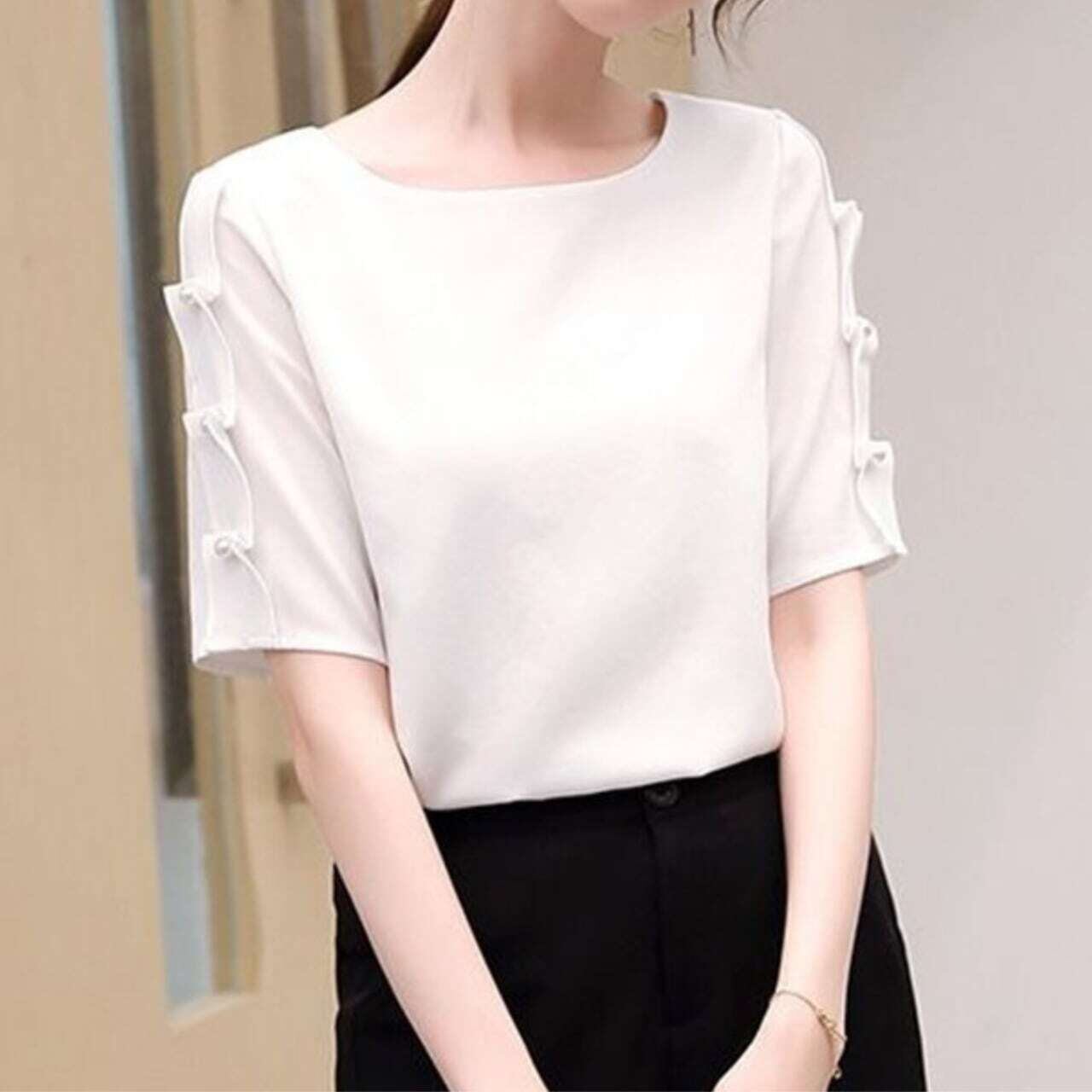 7分袖パール付デザインスリーブトップス