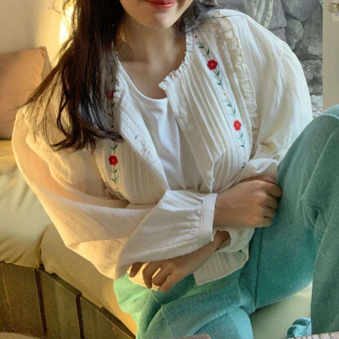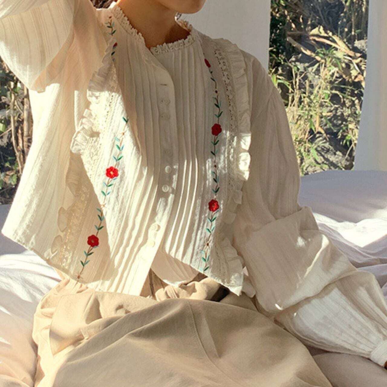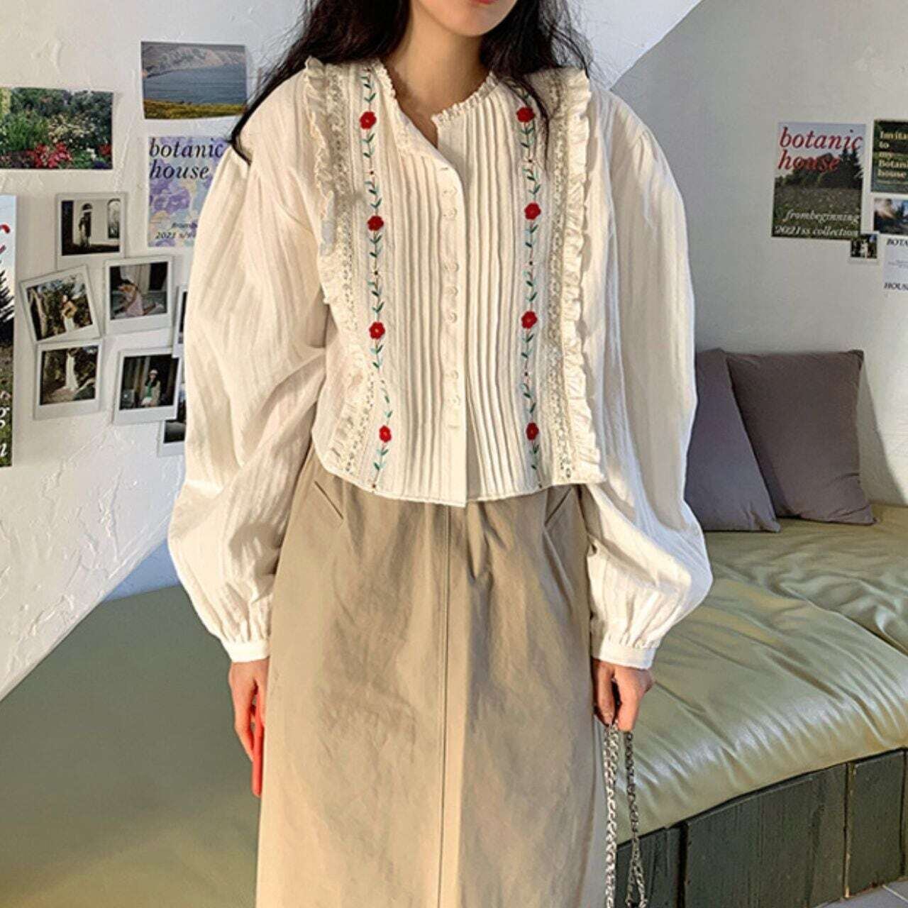 タックフリルフラワー刺繍長袖ブラウス