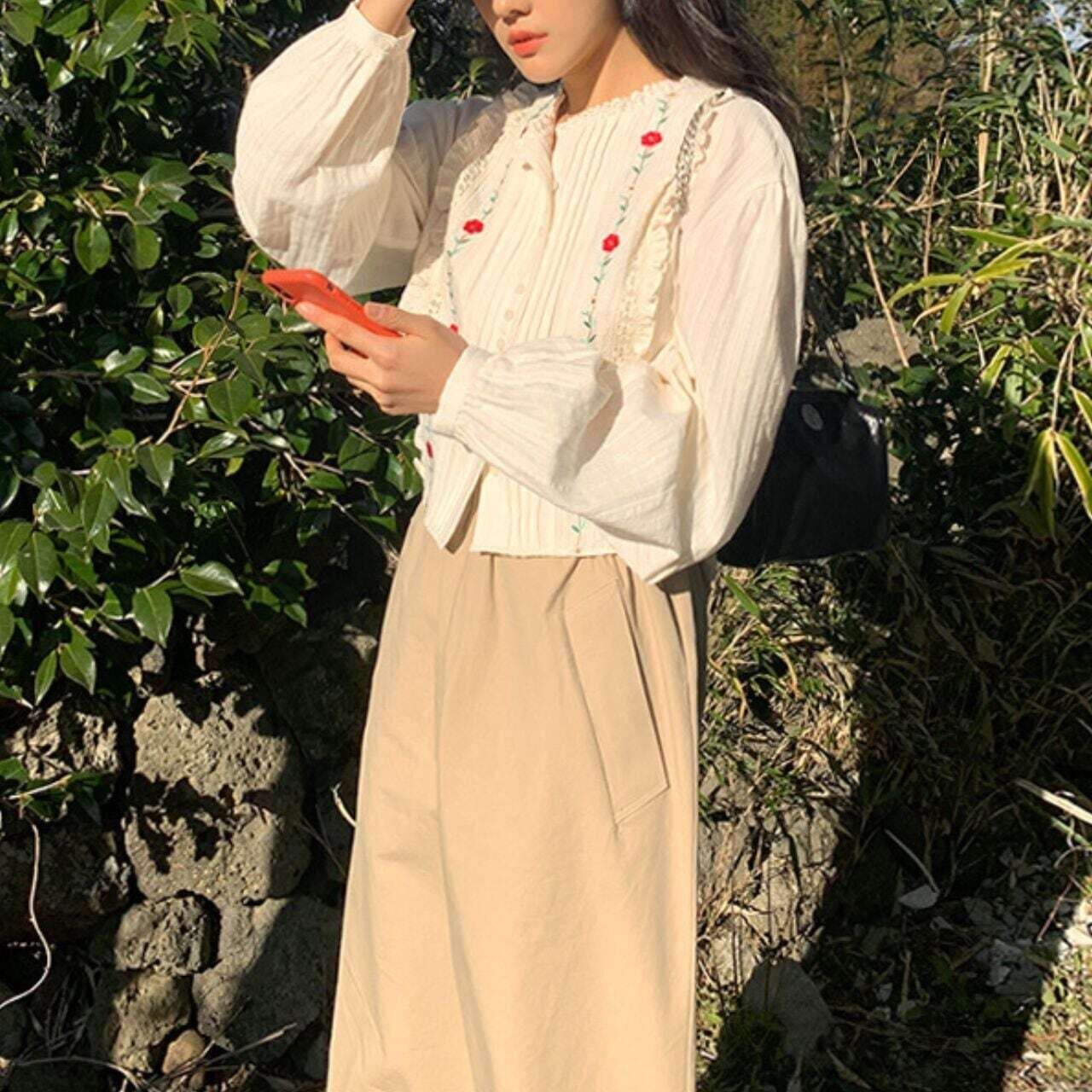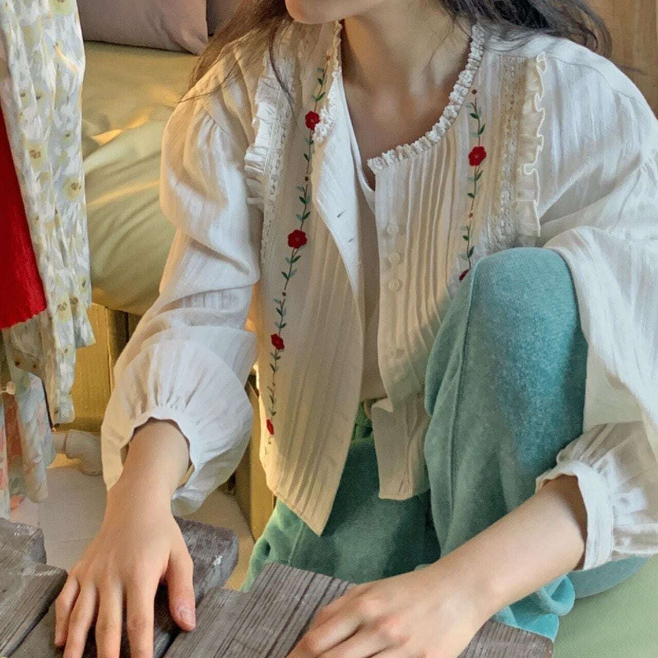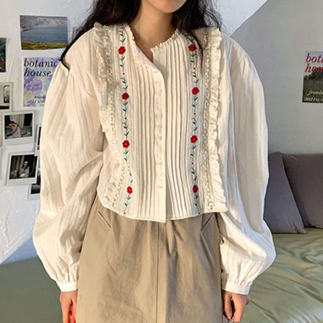タックフリルフラワー刺繍長袖ブラウス