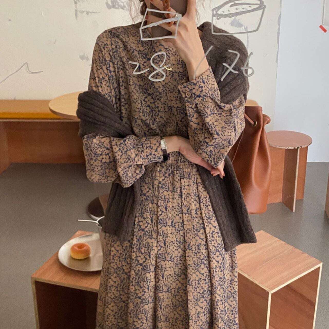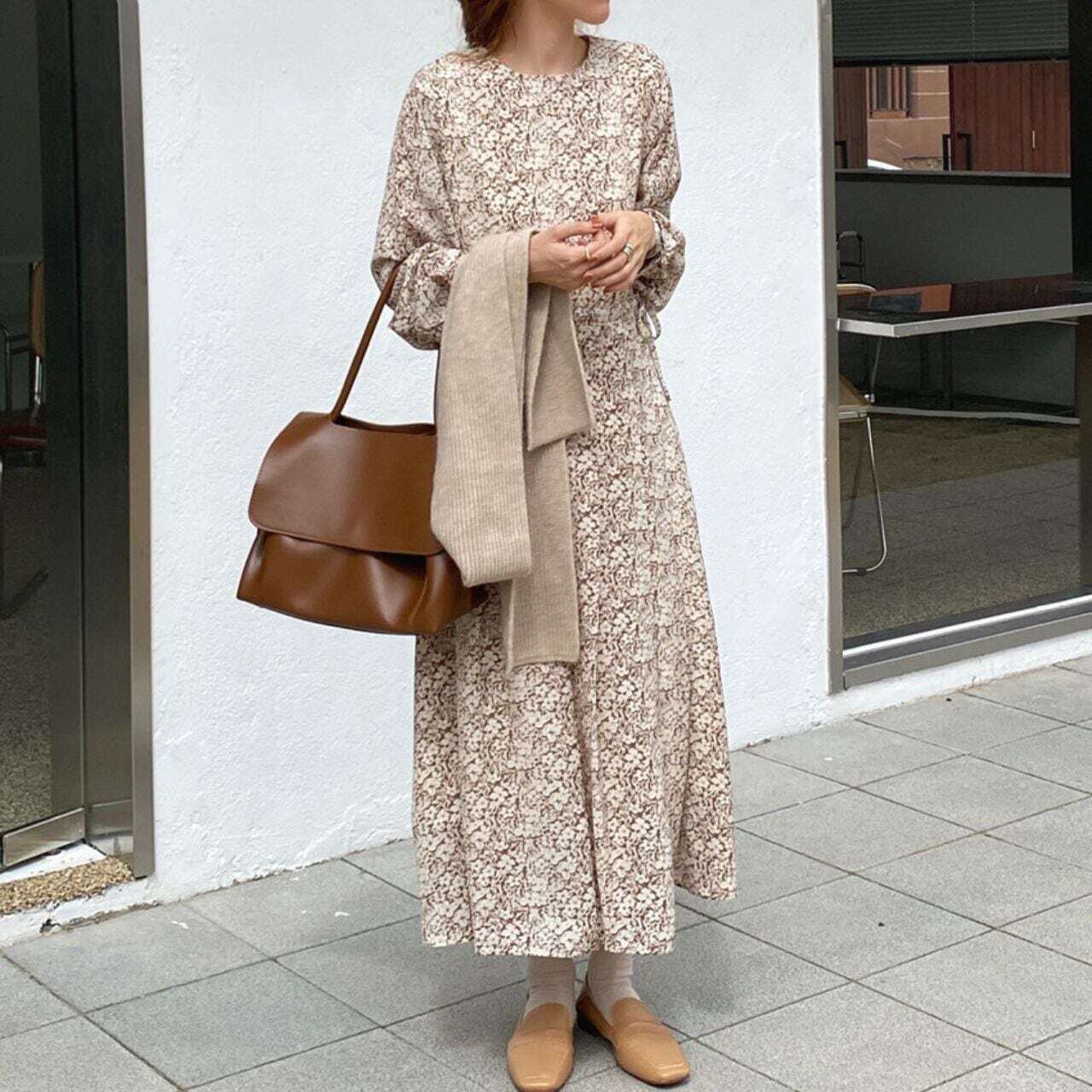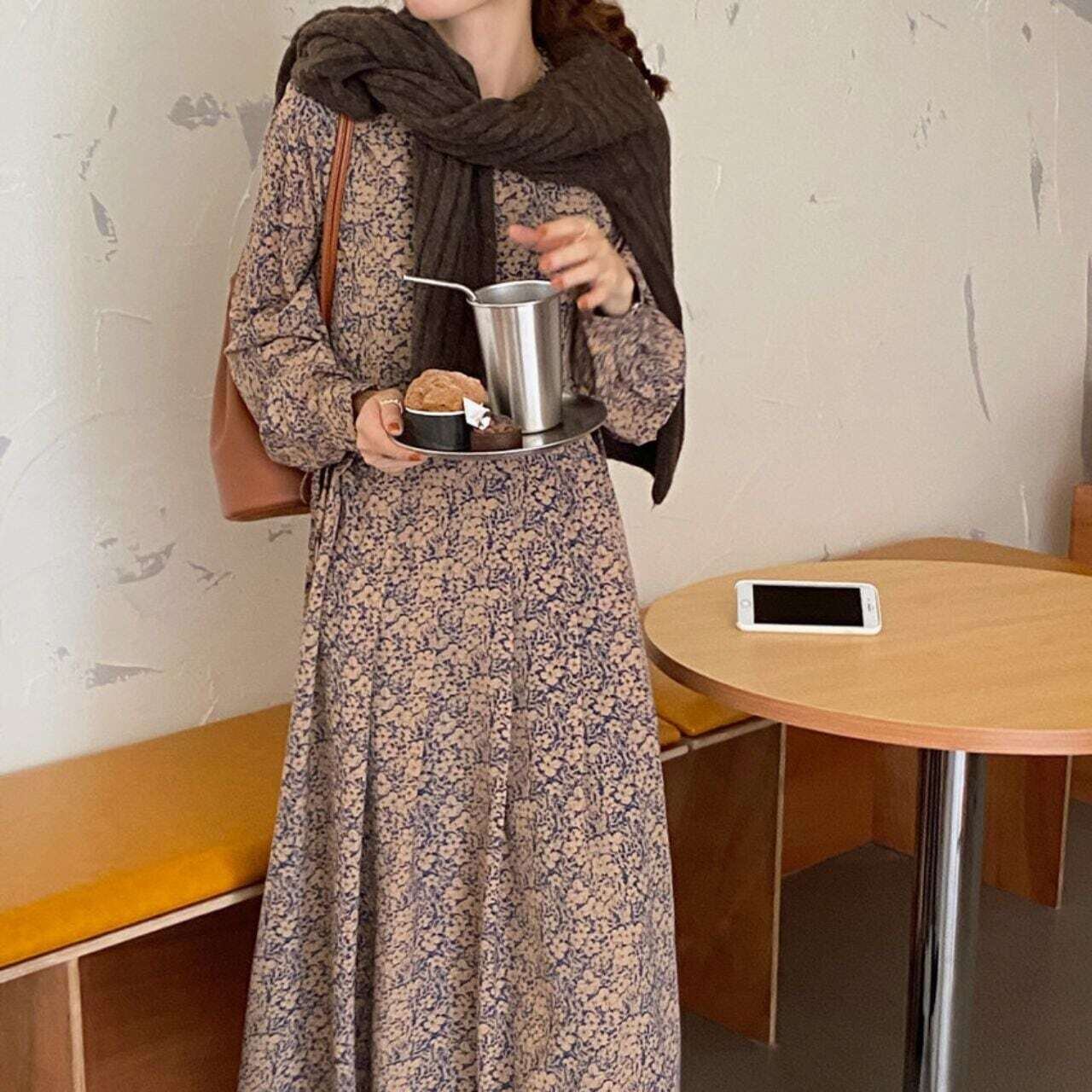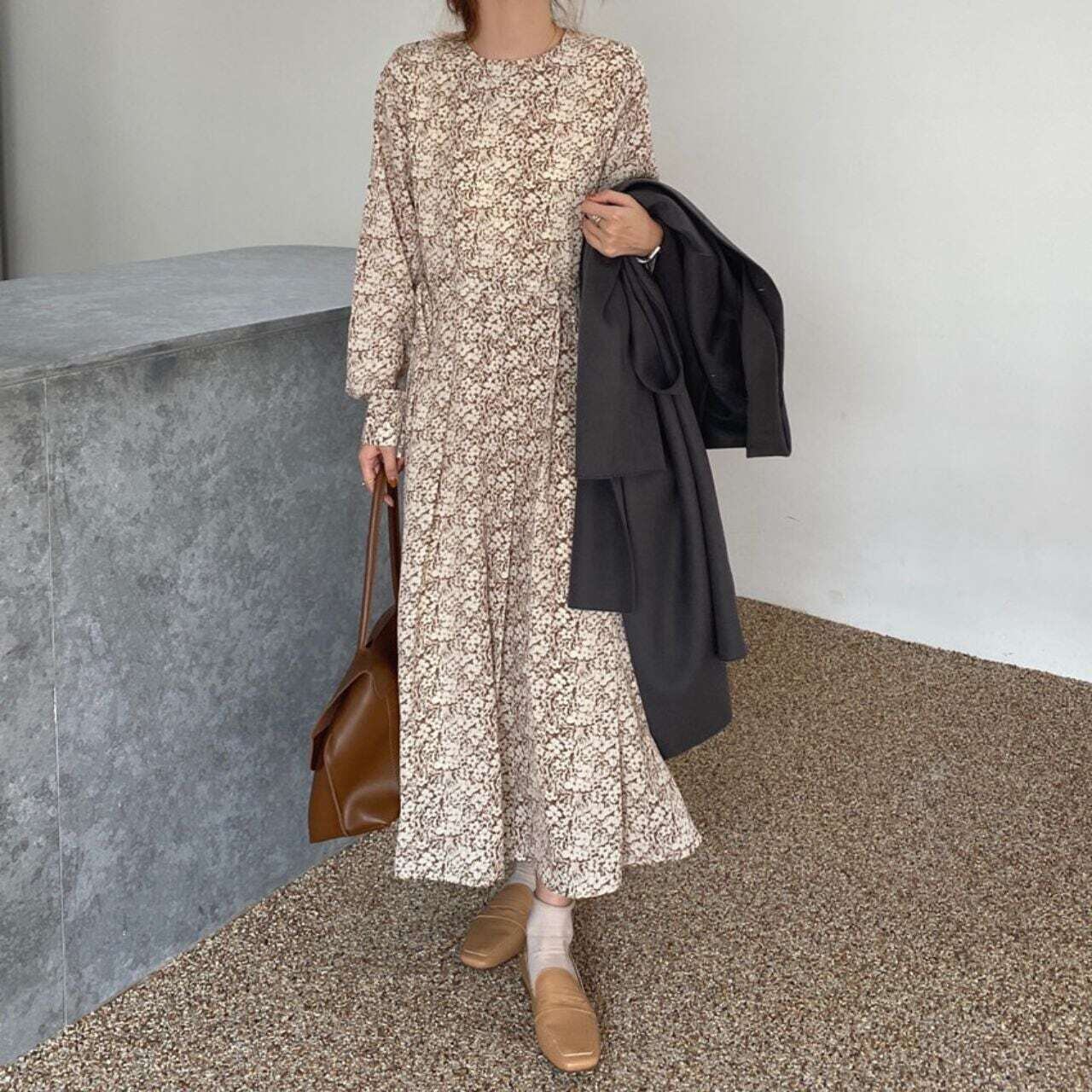 小花柄タックプリーツロングワンピース