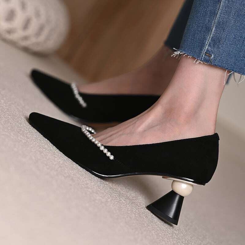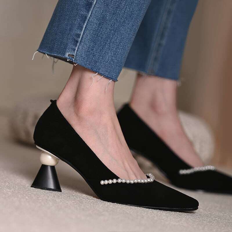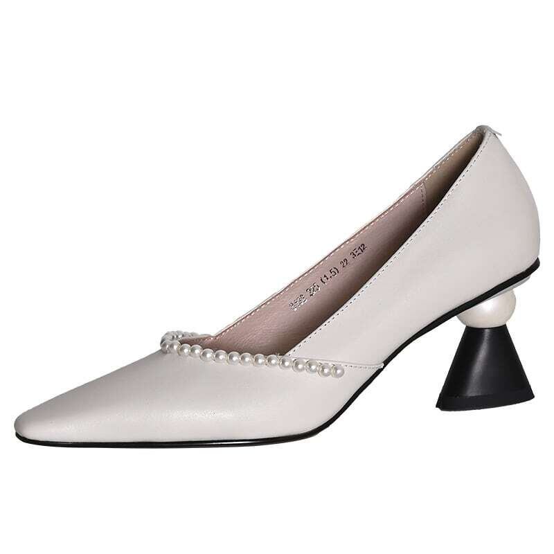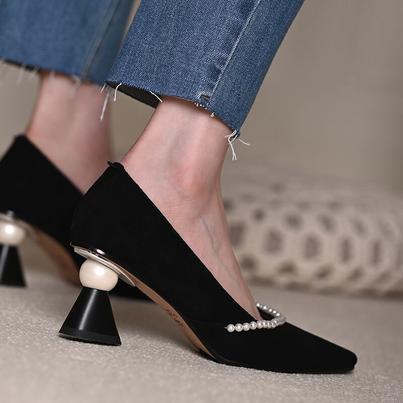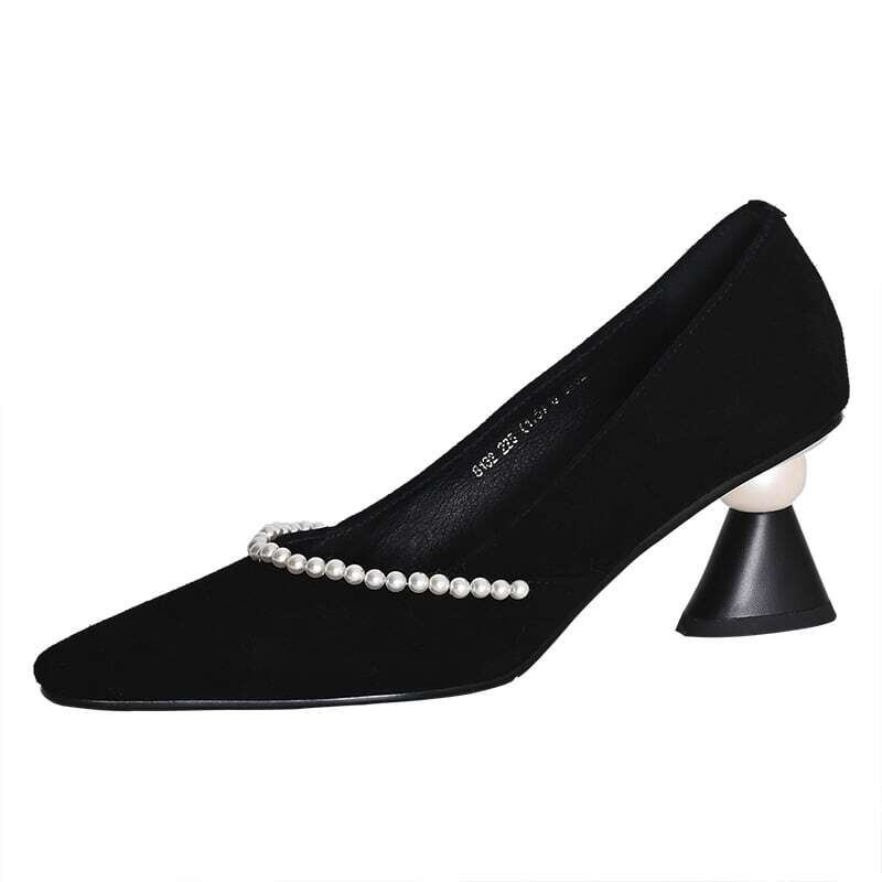 パールトリム&ビックバールヒールデザインパンプス