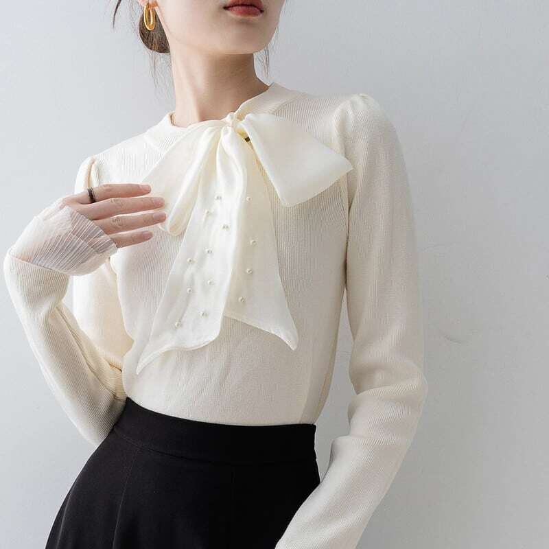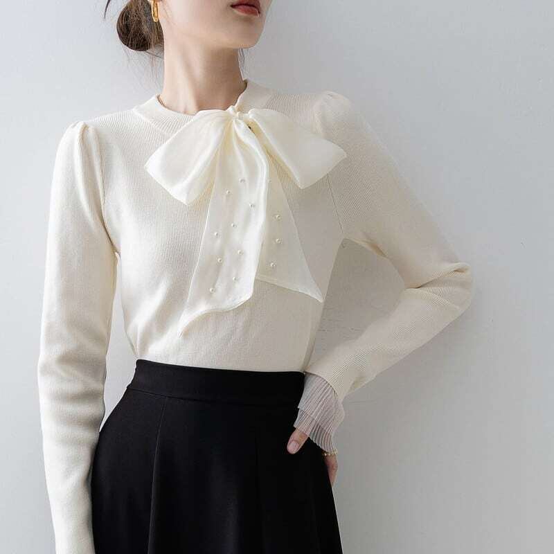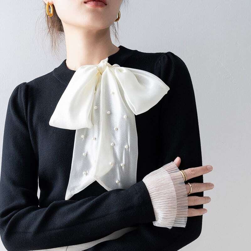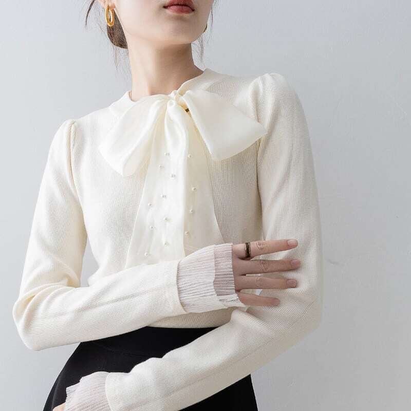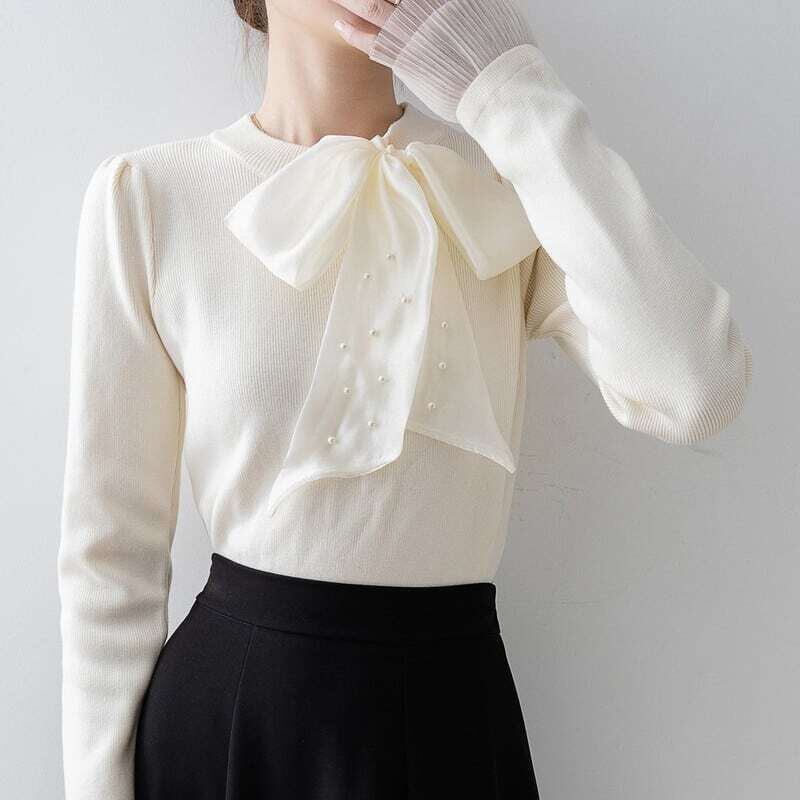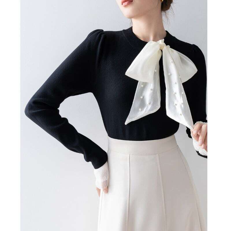 Pearl ribbon slim knit sweater パールリボンスリムニットセーター