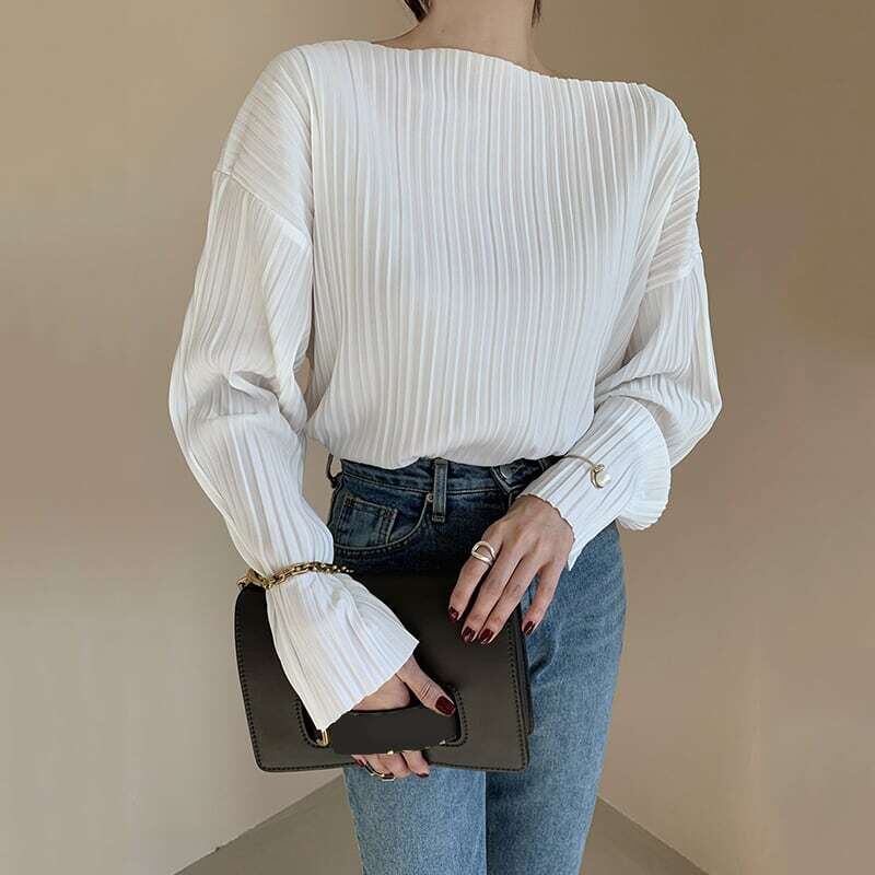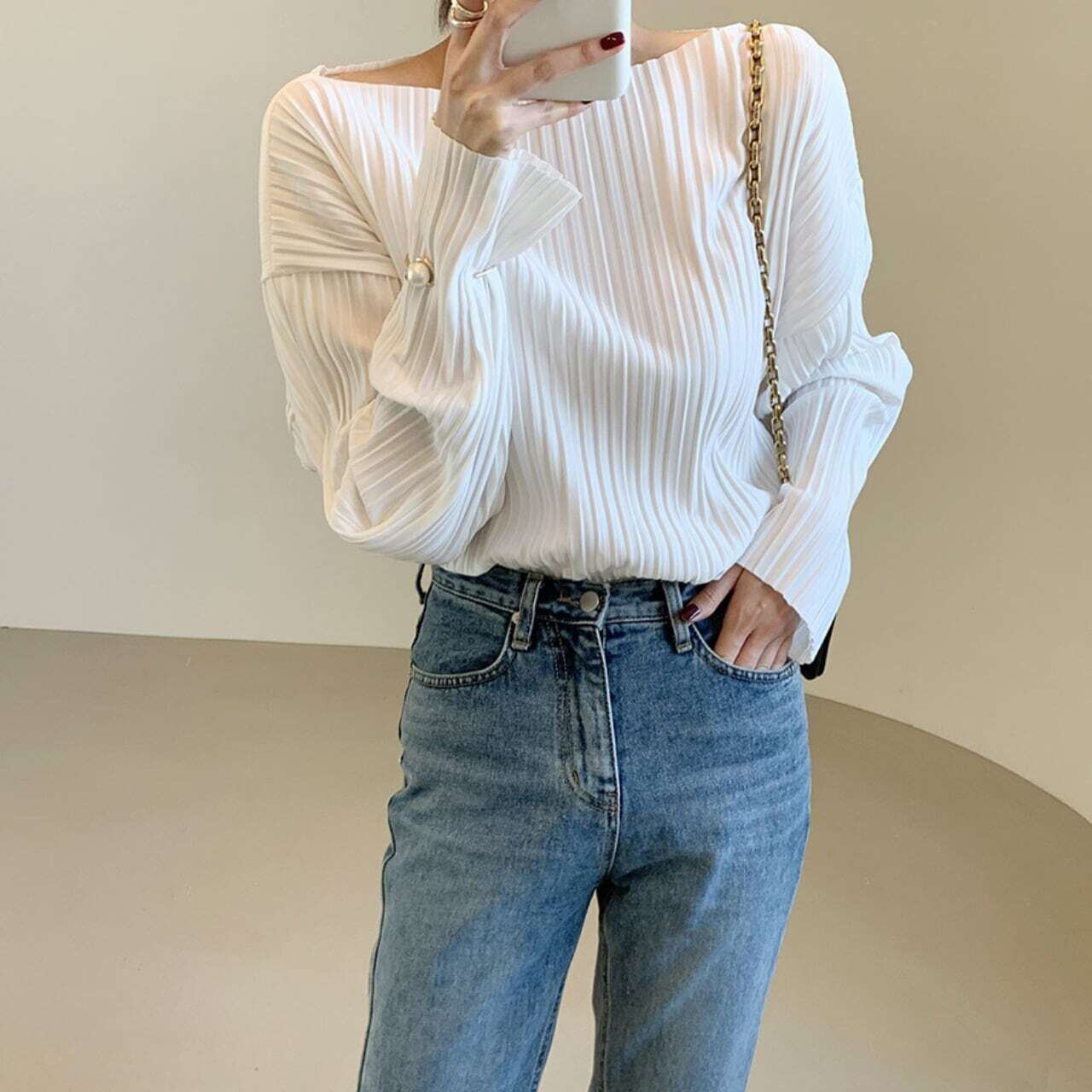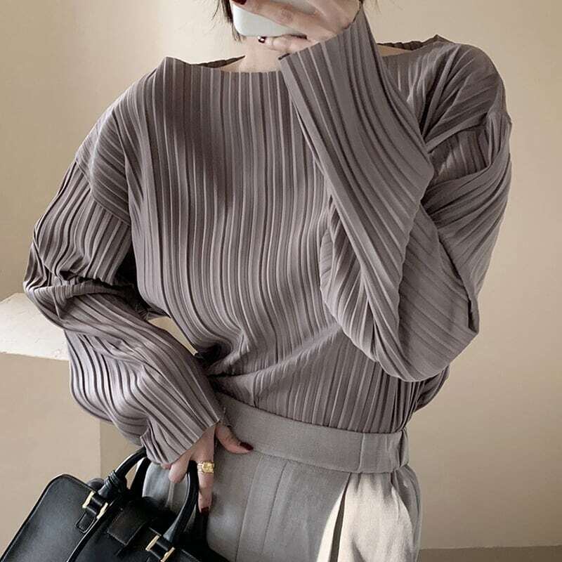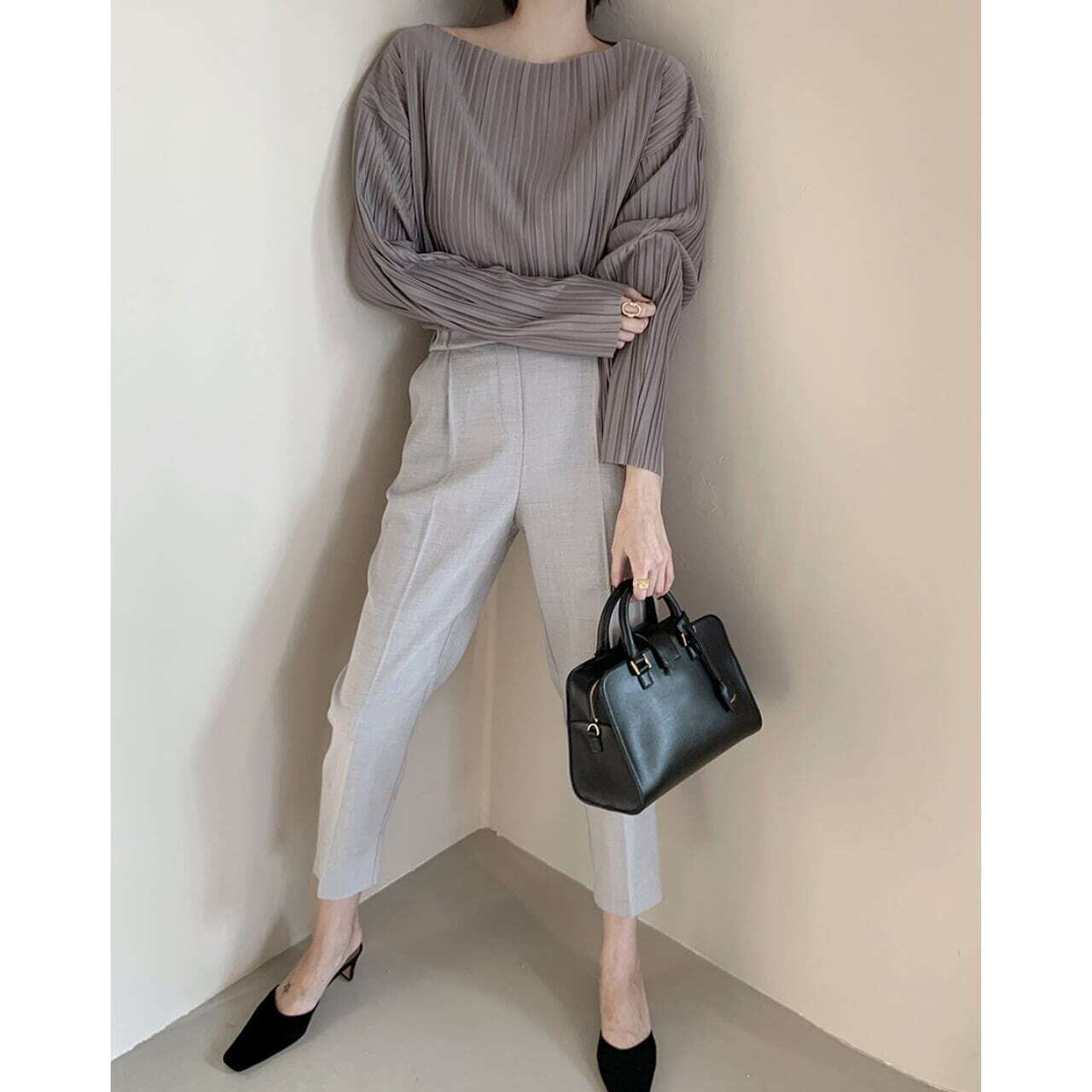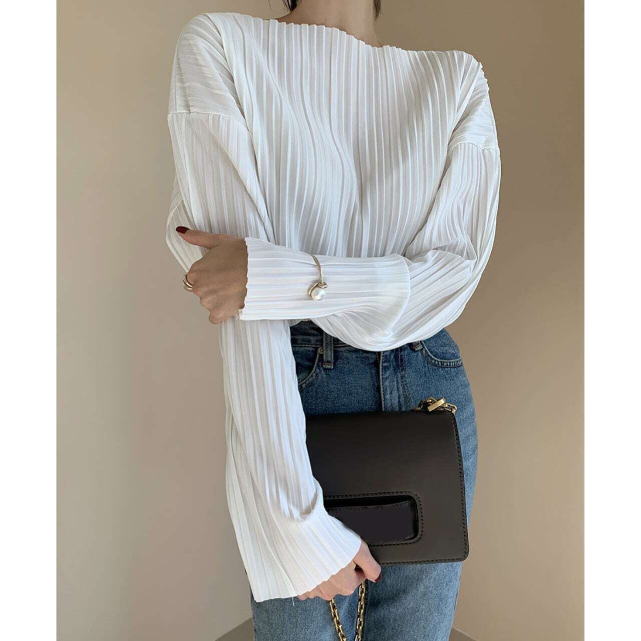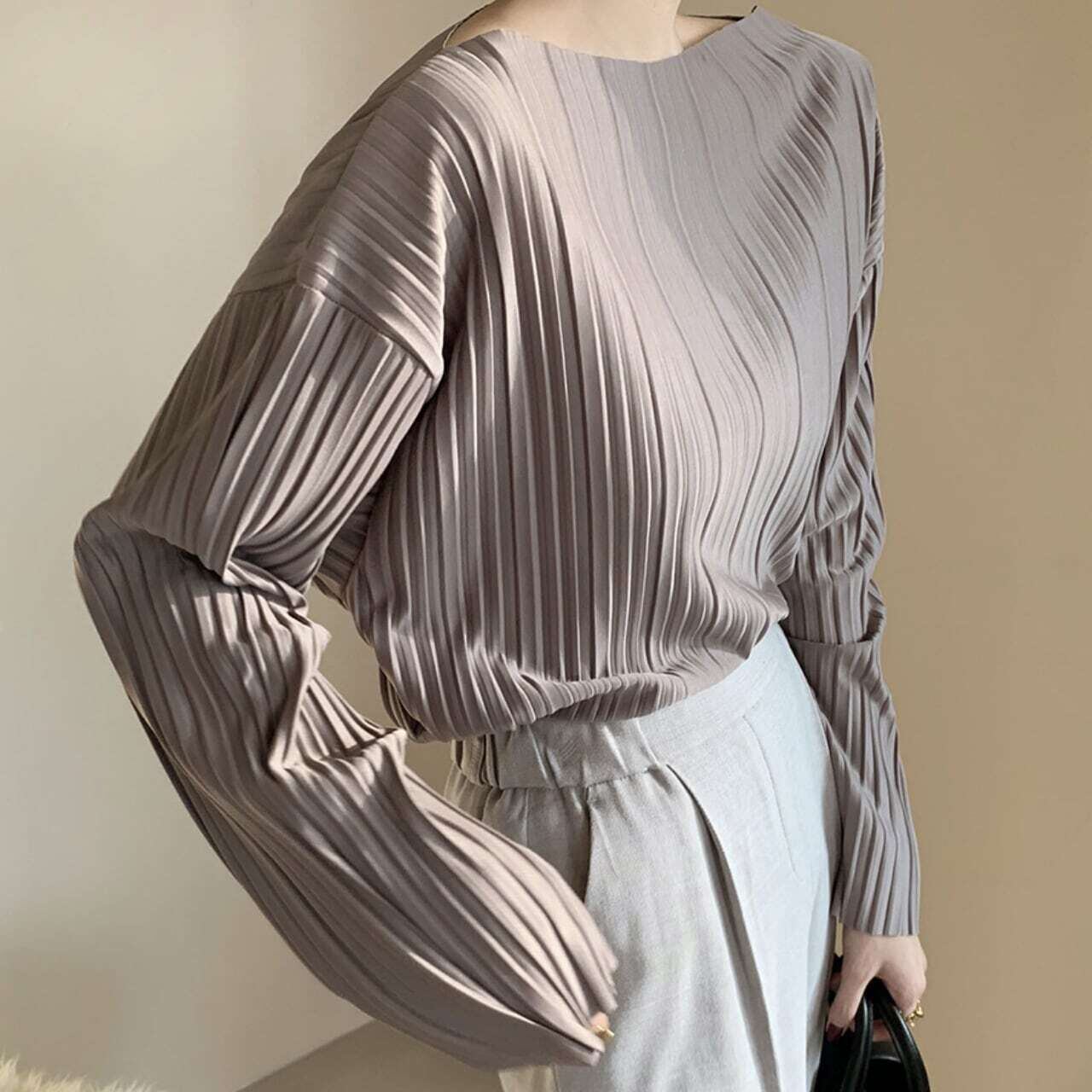 Round neck loose pleated tops ラウンドネックルーズプリーツトップス