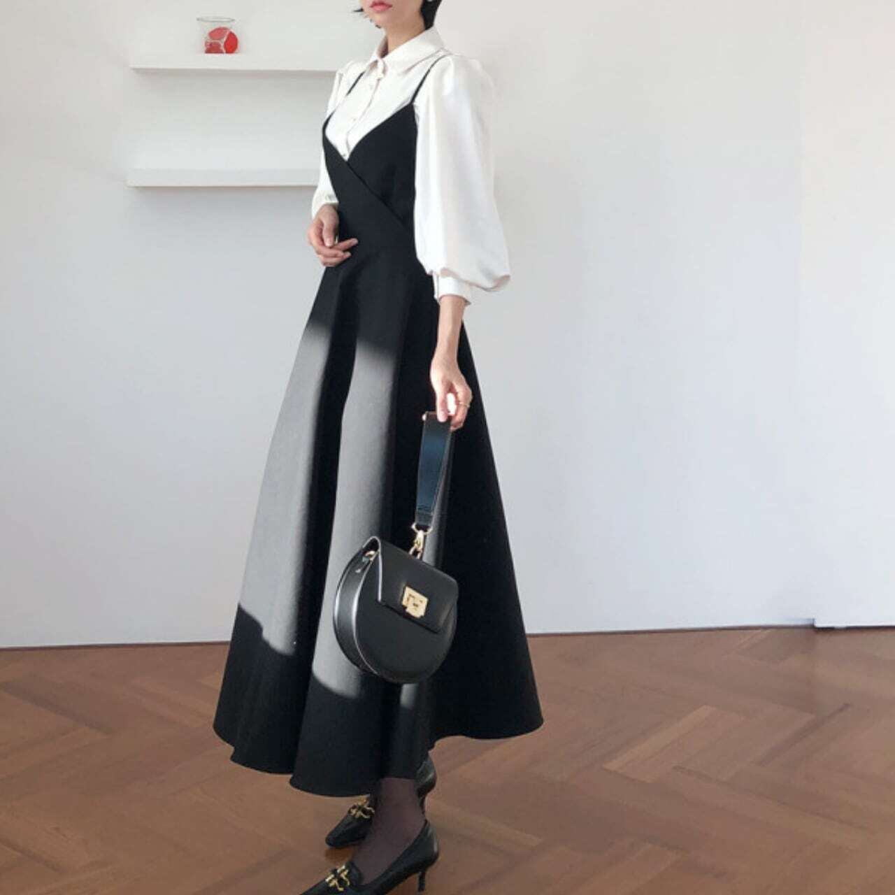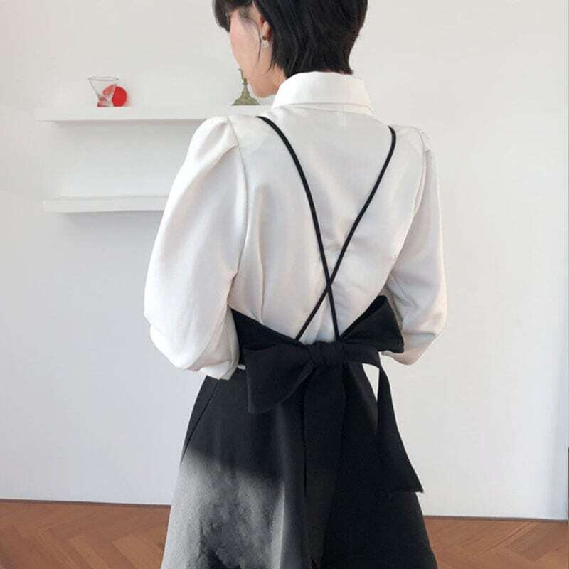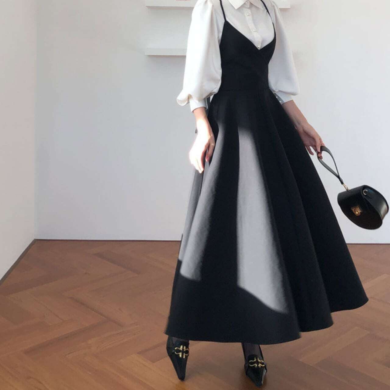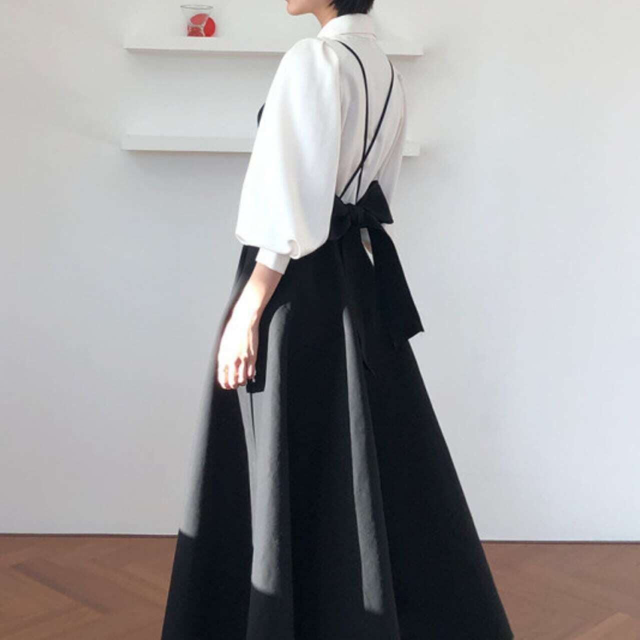 Pearl blouse & back ribbon camisole dress set パールブラウス&バックリボンキャミソールドレスセット