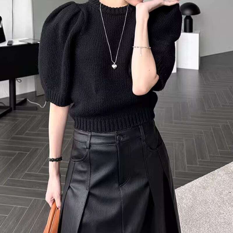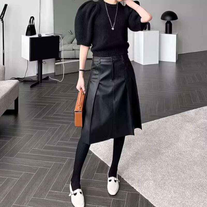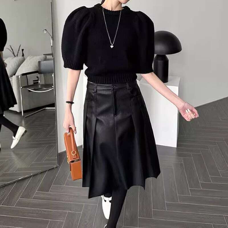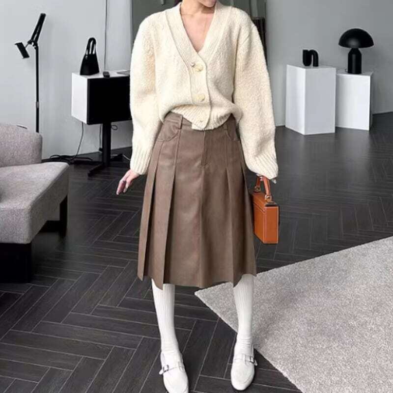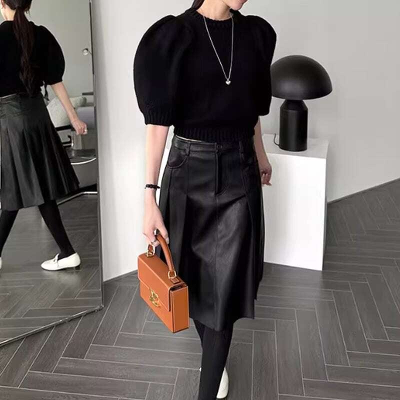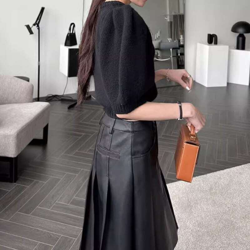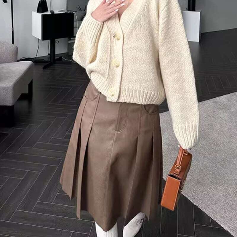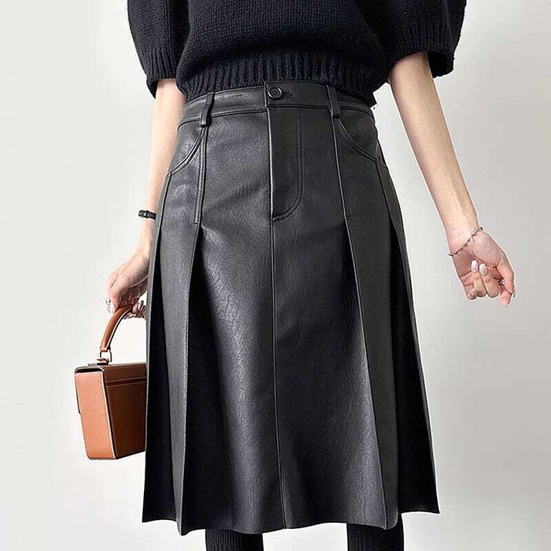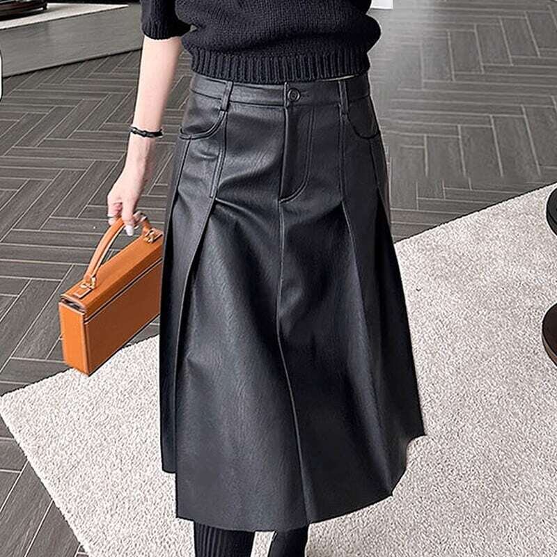 Double pocket pleated PU leather skirt ダブルポケットプリーツPUレザースカート